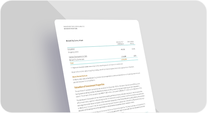 285 265 270 260 275 280 281.3 -8.5 +2.2 +0.3 -4.8 +4.6 -2.0 271.5 -1.6 HK$ Bn At 1st Jan 2024 At 31st Dec 2024 Movement in Investment Properties At 1st January 2024 Net fair value losses in Hong Kong Net fair value gains in the Chinese Mainland Net fair value gains in the U.S.A. Additions Transfer to assets classified as held for sale Net transfers to other assets Translation differences At 31st December 2024 56 MANAGEMENT DISCUSSION & ANALYSIS REVIEW OF OPERATIONS Brickell City Centre, Miami GFA (sq. ft.)(1) (100% Basis) Attributable Interest Completed Shopping centre 496,508 62.9% Held for Development or Sale Brickell City Centre land 1,510,000 100% Total 2,006,508 (1) Represents leasable/saleable area except for the car parking spaces, roof top and circulation areas. As part of our active capital recycling strategy, we will continue to explore divestment opportunities in the U.S.A. Miami Market Outlook In Miami, retail sales at the Brickell City Centre mall are expected to continue to benefit from an improving tenant mix and population growth in central Miami. Valuation of Investment Properties The portfolio of investment properties was valued at 31st December 2024 on the basis of market value (97% by value having been valued by Cushman & Wakefield Limited and 1% by value having been valued by another independent valuer). The amount of this valuation was HK$271,502 million, compared to HK$281,271 million at 31st December 2023. The decrease in the valuation of the investment property portfolio primarily reflected a decrease in the fair value of the office investment properties in Hong Kong, transfer of investment property to assets classified as held for sale and foreign exchange translation losses in respect of the investment properties in the Chinese Mainland, partly offset by the additions in 2024 and an increase in the fair value of the existing retail investment properties in the Chinese Mainland (reflecting a reduction of 25 basis points in the capitalisation rates of certain properties and an increase in rent). Under HKAS 40, hotel properties are not accounted for as investment properties. The hotel buildings are included within property, plant and equipment. The leasehold land is included within right-of-use assets. Both are recorded at cost less accumulated depreciation or amortisation and any provision for impairment.