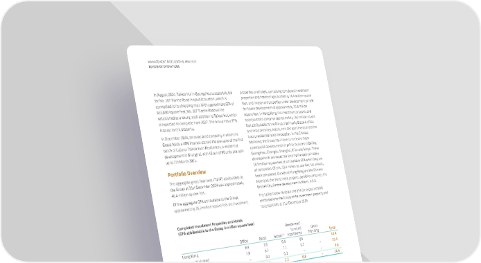34 MANAGEMENT DISCUSSION & ANALYSIS REVIEW OF OPERATIONS Completed Investment Properties and Hotels (GFA attributable to the Group in million square feet) Office Retail Hotels(1) Residential/ Serviced Apartments Under Planning Total Hong Kong 9.4 2.6 0.8 0.6 – 13.4 Chinese Mainland 2.9 6.2 1.1 0.2 – 10.4 U.S.A. – 0.3 0.3 – – 0.6 Total 12.3 9.1 2.2 0.8 – 24.4 In August 2024, Taikoo Hui in Guangzhou successfully bid for No. 387 Tianhe Road in a public auction, which is connected to its shopping mall. With approximate GFA of 655,000 square feet, No. 387 Tianhe Road will be refurbished as a luxury retail addition to Taikoo Hui, which is expected to complete from 2027. The Group has a 97% interest in this property. In December 2024, an associated company in which the Group holds a 40% interest started the pre-sales of the first batch of Lujiazui Taikoo Yuan Residences, a residential development in Shanghai, with 49 out of 50 units pre-sold up to 7th March 2025. Portfolio Overview The aggregate gross floor area (“GFA”) attributable to the Group at 31st December 2024 was approximately 40.4 million square feet. Of the aggregate GFA attributable to the Group, approximately 35.2 million square feet are investment properties and hotels, comprising completed investment properties and hotels of approximately 24.4 million square feet, and investment properties under development or held for future development of approximately 10.8 million square feet. In Hong Kong, the investment property and hotel portfolio comprise approximately 14.2 million square feet attributable to the Group of primarily Grade-A office and retail premises, hotels, serviced apartments and other luxury residential accommodation. In the Chinese Mainland, the Group has interests in eleven major commercial developments in prime locations in Beijing, Guangzhou, Chengdu, Shanghai, Xi’an and Sanya. These developments are expected to comprise approximately 18.9 million square feet of attributable GFA when they are all completed. Of this, 10.4 million square feet has already been completed. Outside of Hong Kong and the Chinese Mainland, the investment property portfolio comprises the Brickell City Centre development in Miami, U.S.A. The tables below illustrate the GFA (or expected GFA) attributable to the Group of the investment property and hotel portfolio at 31st December 2024.