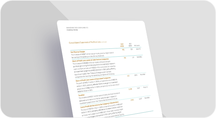 76 MANAGEMENT DISCUSSION & ANALYSIS FINANCIAL REVIEW Consolidated Statement of Profit or Loss (continued) 2024 HK$M 2023 HK$M Reference Net Finance Charges The increase of HK$471 million was principally due to a higher level of borrowings in Hong Kong and the Chinese Mainland. 991 520 Note 10 Share of Profit Less Losses of Joint Venture Companies The increase of HK$580 million principally reflected a bargain purchase gain arising from the acquisition of an additional interest in a joint venture company of HK$566 million and a lower fair value loss on investment properties of HK$138 million in 2024, partly offset by loss of contribution from Taikoo Li Chengdu as joint venture companies after turning into subsidiary companies of the Group. 704 124 Note 8(a) Share of Profit Less Losses of Associated Companies The profit of HK$122 million in 2024, compared to a loss of HK$416 million in 2023, primarily reflected the fair value gain on investment properties of HK$83 million in 2024, compared to the fair value loss of HK$454 million in 2023. 122 (416) Note 8(a) Taxation The increase of HK$521 million was principally due to an increase in deferred tax in relation to the fair value changes in respect of investment properties in the Chinese Mainland and the U.S.A. 2,138 1,617 Note 11 (Loss)/Profit Attributable to the Company’s Shareholders The loss of HK$766 million in 2024, compared to a profit of HK$2,637 million in 2023, principally reflected an increase in the fair value loss on investment properties of HK$3,167 million, lower revenue, higher net finance charges and taxation in 2024, partly offset by higher share of profit less losses of joint venture and associated companies. (766) 2,637 Note 8(a)