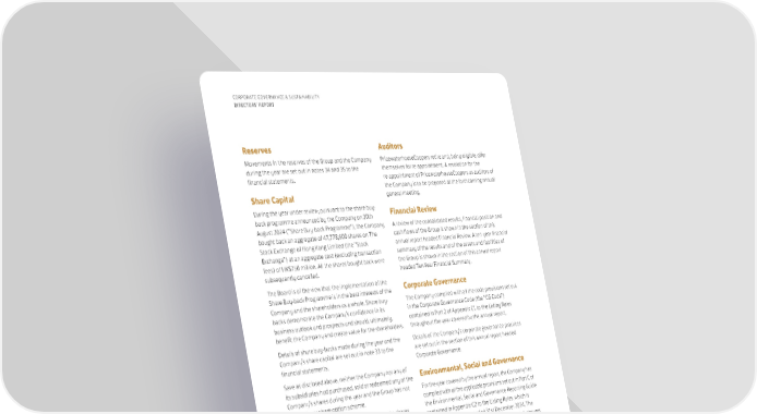 120 CORPORATE GOVERNANCE & SUSTAINABILITY DIRECTORS’ REPORT Reserves Movements in the reserves of the Group and the Company during the year are set out in notes 34 and 35 to the financial statements. Share Capital During the year under review, pursuant to the share buy- back programme announced by the Company on 30th August 2024 (“Share Buy-back Programme”), the Company bought back an aggregate of 47,778,600 shares on The Stock Exchange of Hong Kong Limited (the “Stock Exchange”) at an aggregate cost (excluding transaction fees) of HK$750 million. All the shares bought back were subsequently cancelled. The Board is of the view that the implementation of the Share Buy-back Programme is in the best interests of the Company and the shareholders as a whole. Share buy- backs demonstrate the Company’s confidence in its business outlook and prospects and should, ultimately, benefit the Company and create value for the shareholders. Details of share buy-backs made during the year and the Company’s share capital are set out in note 33 to the financial statements. Save as disclosed above, neither the Company nor any of its subsidiaries had purchased, sold or redeemed any of the Company’s shares during the year and the Group has not adopted any share option scheme. At 31st December 2024, taking into account the shares bought back and cancelled, 5,814,221,400 shares were in issue (31st December 2023: 5,850,000,000 shares). The term of the Share Buy-Back Programme will expire on the date falling one day prior to the 2025 Annual General Meeting. Accounting Policies The material accounting policies of the Group are set out in the relevant notes to the financial statements (if they relate to a particular item) and in the section of this annual report headed Accounting Policies. Auditors PricewaterhouseCoopers retire and, being eligible, offer themselves for re-appointment. A resolution for the re-appointment of PricewaterhouseCoopers as auditors of the Company is to be proposed at the forthcoming annual general meeting. Financial Review A review of the consolidated results, financial position and cash flows of the Group is shown in the section of this annual report headed Financial Review. A ten-year financial summary of the results and of the assets and liabilities of the Group is shown in the section of this annual report headed Ten-Year Financial Summary. Corporate Governance The Company complied with all the code provisions set out in the Corporate Governance Code (the “CG Code”) contained in Part 2 of Appendix C1 to the Listing Rules throughout the year covered by the annual report. Details of the Company’s corporate governance practices are set out in the section of this annual report headed Corporate Governance. Environmental, Social and Governance For the year covered by the annual report, the Company has complied with all the applicable provisions set out in Part C of the Environmental, Social and Governance Reporting Guide contained in Appendix C2 to the Listing Rules, which is applicable for the year ended 31st December 2024. The Company has also referenced the climate-related disclosures set out in Part D of the revised Environmental, Social and Governance Reporting Code contained in Appendix C2, which became effective for financial years commencing on or after 1st January 2025. These disclosures are included in the Sustainability Report 2024 of the Company. Donations During the year, the Group made donations for charitable purposes of HK$90 million and donations towards various scholarships of HK$0.3 million.