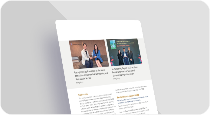 131 SWIRE PROPERTIES ANNUAL REPORT 2024 Biodiversity The newly completed Taikoo Square and Taikoo Garden exemplify Swire Properties’ commitment to biophilic design, promoting urban biodiversity through over 70,000 sq. ft. of green space. Featuring more than 260 carefully selected native and exotic plant species, these gardens enhance ecological value and provide open spaces for the community. Over 40 walking tours, with approximately 750 participants from Government, business partners, professional bodies, and media, have been conducted at Taikoo Square to promote the importance of biodiversity. Green Building In 2024, Taikoo Place became the first and the only project in the Greater Bay Area to achieve Platinum certification under LEED v.4.1 for Communities: Existing (as of December 2024). ONE INDIGO was recognised as the first project in the Chinese Mainland to achieve LEED Zero Water certification. Most recently, Two Taikoo Place was featured on the 2024 Sustainable Frontiers List, becoming the only project in Hong Kong included in the LEED “Campaign: Frontiers” programme. At the RICS Awards Hong Kong 2024, Taikoo Place received the Environmental Impact Award, and Two Taikoo Place was honoured as the winner of the Construction Project Management Team of the Year. Furthermore, Two Taikoo Place won the Urban Land Institute (ULI) 2024 Asia Pacific Awards for Excellence at the ULI Asia Pacific Summit in Tokyo, marking Taikoo Place’s second recognition since 2020. Performance (Economic) We believe that long-term value creation depends on the sustainable development of our business. Details of our financial performance in 2024 can be found in other parts of this report. As of 31st December 2024, approximately 70% of our financing came from green bonds, sustainability-linked loans and green loans. In 2024, we issued green bonds totalling approximately HK$6.9 billion, of which RMB3.5 billion was issued by way of dim sum bond in September 2024. This year, we have launched an integrated Climate and Nature-related Financial Disclosures in our Sustainability Report. This section is prepared in alignment with the Environmental, Social and Governance (ESG) Reporting Guide contained in Appendix C2 to the Listing Rules from the Stock Exchange of Hong Kong Limited (HKEX) and with reference to the Taskforce on Nature-related Financial Disclosures (TNFD) Recommendations and the updated ESG Reporting Code from the HKEX, which takes effect on 1st January, 2025. Further details of our sustainable development performance, including details of our SD 2030 Strategy, can be found in our Sustainability Report 2024. Sustainability Report 2023 received Best Environmental, Social and Governance Reporting Award Hong Kong Recognised by Randstad as the Most Attractive Employer in the Property and Real Estate Sector Hong Kong