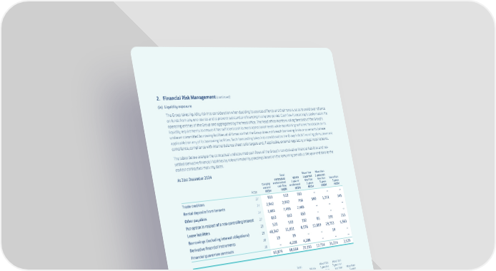 147 SWIRE PROPERTIES ANNUAL REPORT 2024 2. Financial Risk Management (continued) (iv) Liquidity exposure The Group takes liquidity risk into consideration when deciding its sources of funds and their tenors, so as to avoid over reliance on funds from any one source and to prevent substantial refinancing in any one period. Cash flow forecasting is performed in the operating entities of the Group and aggregated by the head office. The head office monitors rolling forecasts of the Group’s liquidity requirements to ensure it has sufficient cash to meet operational needs while maintaining sufficient headroom on its undrawn committed borrowing facilities at all times so that the Group does not breach borrowing limits or covenants (where applicable) on any of its borrowing facilities. Such forecasting takes into consideration the Group’s debt financing plans, covenant compliance, compliance with internal balance sheet ratio targets and, if applicable, external regulatory or legal requirements. The tables below analyse the contractual undiscounted cash flows of the Group’s non-derivative financial liabilities and net- settled derivative financial liabilities by relevant maturity groupings based on the remaining periods at the year-end date to the earliest contractual maturity dates. At 31st December 2024 Note Carrying amount HK$M Total contractual undiscounted cash flow HK$M Within 1 year or on demand HK$M More than 1 year but less than 2 years HK$M More than 2 years but less than 5 years HK$M More than 5 years HK$M Trade creditors 27 933 933 933 – – – Rental deposits from tenants 27 2,942 2,942 756 590 1,251 345 Other payables 27 7,465 7,465 7,465 – – – Put option in respect of a non-controlling interest 27 653 653 653 – – – Lease liabilities 28 520 593 102 85 191 215 Borrowings (including interest obligations) 29 48,347 51,851 8,076 12,059 29,753 1,963 Derivative financial instruments 30 19 19 – – 19 – Financial guarantee contracts 38 – 4,208 4,208 – – – 60,879 68,664 22,193 12,734 31,214 2,523 At 31st December 2023 Note Carrying amount HK$M Total contractual undiscounted cash flow HK$M Within 1 year or on demand HK$M More than 1 year but less than 2 years HK$M More than 2 years but less than 5 years HK$M More than 5 years HK$M Trade creditors 27 1,046 1,046 1,046 – – – Rental deposits from tenants 27 2,965 2,965 871 586 1,158 350 Other payables 27 5,138 5,138 5,138 – – – Put option in respect of a non-controlling interest 27 613 613 613 – – – Lease liabilities 28 607 701 99 100 215 287 Borrowings (including interest obligations) 29 41,169 45,531 9,053 7,207 26,830 2,441 Derivative financial instruments 30 22 22 – – 22 – Financial guarantee contracts 38 – 4,069 4,069 – – – 51,560 60,085 20,889 7,893 28,225 3,078