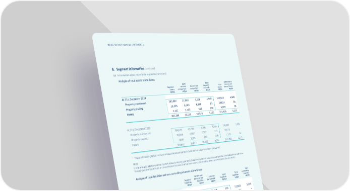 152 NOTES TO THE FINANCIAL STATEMENTS 8. Segment Information (continued) (a) Information about reportable segments (continued) Analysis of total assets of the Group Segment assets HK$M Joint venture companies* HK$M Associated companies* HK$M Bank deposits and cash HK$M Total assets HK$M Additions to non-current assets (Note) HK$M At 31st December 2024 Property investment 283,907 27,660 3,316 4,940 319,823 4,880 Property trading 15,235 6,760 6,968 51 29,014 85 Hotels 4,157 1,710 592 130 6,589 68 303,299 36,130 10,876 5,121 355,426 5,033 At 31st December 2023 Property investment 289,079 25,799 8,366 4,854 328,098 3,206 Property trading 10,869 6,057 2,167 127 19,220 – Hotels 4,594 2,201 259 116 7,170 67 304,542 34,057 10,792 5,097 354,488 3,273 * The assets relating to joint venture and associated companies include the loans due from these companies. Note: In this analysis, additions to non-current assets during the year exclude joint venture and associated companies, financial assets at fair value through profit or loss and other comprehensive income, financial instruments, deferred tax assets and retirement benefit assets. Analysis of total liabilities and non-controlling interests of the Group Segment liabilities HK$M Current and deferred tax liabilities HK$M External borrowings HK$M Lease liabilities HK$M Total liabilities HK$M Non- controlling interests HK$M At 31st December 2024 Property investment 10,184 14,900 26,458 516 52,058 3,055 Property trading 2,718 137 21,329 – 24,184 – Hotels 193 – 560 4 757 46 13,095 15,037 48,347 520 76,999 3,101 At 31st December 2023 Property investment 8,196 14,370 25,396 599 48,561 3,025 Property trading 1,670 89 14,422 – 16,181 1 Hotels 237 1 1,351 8 1,597 41 10,103 14,460 41,169 607 66,339 3,067