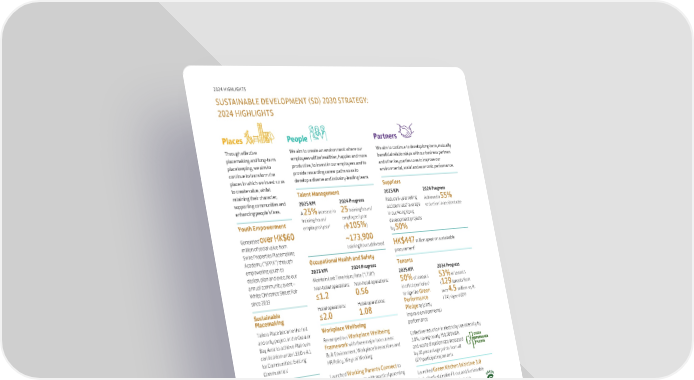 10 SUSTAINABLE DEVELOPMENT (SD) 2030 STRATEGY: 2024 HIGHLIGHTS 2024 HIGHLIGHTS Through effective placemaking and long-term placekeeping, we aim to continue to transform the places in which we invest so as to create value, whilst retaining their character, supporting communities and enhancing people’s lives. Youth Empowerment Generated over HK$60 million of social value from Swire Properties Placemaking Academy (“SPPA”) through empowering youth to design, plan and execute our annual community event – White Christmas Street Fair since 2019 Sustainable Placemaking Taikoo Place became the first and only project in the Greater Bay Area to achieve Platinum certification under LEED v.4.1 for Communities: Existing Communities1 Wellbeing Launched the new Taikoo Square and Taikoo Garden, offering more than 70,000 sq. ft. of green space, representing a nature-based solution to further enhance urban biodiversity, increase climate resilience, and promote the wellbeing of communities We aim to create an environment where our employees will be healthier, happier and more productive, to invest in our employees and to provide rewarding career paths so as to develop a diverse and industry-leading team. Talent Management 2025 KPI A 25% increase in training hours/ employee/year2 2024 Progress 25 training hours/ employee/year ( 105%) ~173,900 training hours delivered Occupational Health and Safety 2025 KPI 2024 Progress Maintain Lost Time Injury Rate (“LTIR”) Non-hotel operations: ≤1.2 Hotel operations: ≤2.0 Non-hotel operations: 0.56 Hotel operations: 1.08 Workplace Wellbeing Revamped our Workplace Wellbeing Framework with three major focus areas: Built Environment, Workplace Interactions and HR Policy, Ways of Working Launched Working Parents Connect to equip working parents with practical parenting knowledge and tools to promote an inclusive and supportive workplace Diversity and Inclusion 2025 KPI Maintain a female representation of no less than 40% in the workforce Maintain a gender balance in strategic leadership Maintain gender pay ratio at 1:1 2024 Progress 42.5% of the workforce is female 40% of strategic leader positions are held by women Gender pay ratio (female to male)3: 1:0.97 Volunteering Our Community Ambassador Programme contributed 12,696 volunteer service hours, supporting 84 activities We aim to continue to develop long-term, mutually beneficial relationships with our business partners and other key parties so as to improve our environmental, social and economic performance. Suppliers 2025 KPI Reduce 5-year rolling accident rate4 average in our Hong Kong development projects by 50% 2024 Progress Achieved a 55% reduction in accident rate HK$447 million spent on sustainable procurement5 Tenants 2025 KPI 50% of tenants in office portfolios6 to sign the Green Performance Pledge to jointly improve environmental performance 2024 Progress 53% of tenants (129 tenants from over 4.5 million sq. ft. LFA) signed GPP Collective reduction in electricity use intensity by 3.8%, saving nearly 750,000 kWh and waste diversion rate increased by 10 percentage points from all GPP participating tenants Launched Green Kitchen Initiative 3.0 including Sustainable Fit-out and Sustainable Operations Recognition Scheme to incorporate the latest technologies and equipment specifications; and established a new brand identity Launched the Green Retail Partnership Framework, focusing on sustainable shop design, data sharing and shop operation performance improvements; forming a 3-year strategic partnership with a luxury retail conglomerate to improve ESG performance across their stores, offices and F&B locations 1 As at 31st December 2024. 2 Compared to the baseline year of 2016. 3 Gender pay ratio is calculated based on a non-weighted average methodology. 4 Using 2015-2019 (5-year average) as baseline. Accidental rate represents the number of reportable accidents per 1,000 contractor workers. It is calculated as the total number of reportable accidents multiplied by 1,000 and then divided by average daily number of contractor workers on-site. Places People Partners Performance (Environment) Performance (Economic) Places People Partners Performance (Environment) Performance (Economic)