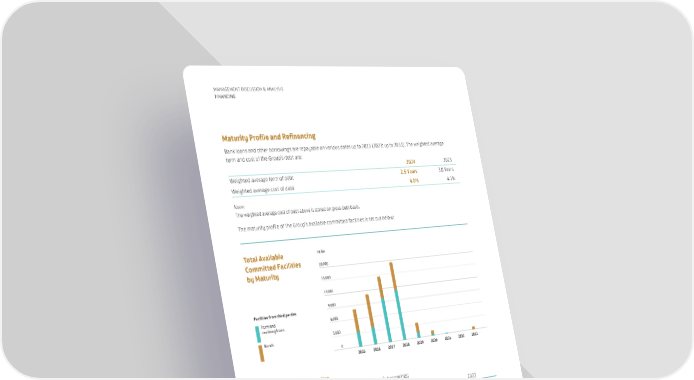 2025 2026 2027 2028 2032 2033 2031 2029 2030 18,000 15,000 12,000 9,000 6,000 3,000 0 Facilities from third parties HK$M Total Available Committed Facilities by Maturity Term and revolving loans Bonds 84 MANAGEMENT DISCUSSION & ANALYSIS FINANCING Maturity Profile and Refinancing Bank loans and other borrowings are repayable on various dates up to 2033 (2023: up to 2033). The weighted average term and cost of the Group’s debt are: 2024 2023 Weighted average term of debt 2.5 Years 3.0 Years Weighted average cost of debt 4.0% 4.1% Note: The weighted average cost of debt above is stated on gross debt basis. The maturity profile of the Group’s available committed facilities is set out below: Audited Financial Information The table below sets forth the maturity profile of the Group’s borrowings: 2024 2023 HK$M HK$M Bank borrowings and bonds from third parties due Within 1 year 6,760 14% 7,563 18% 1-2 years 11,090 23% 6,073 15% 2-5 years 28,626 59% 25,256 61% After 5 years 1,871 4% 2,277 6% Total 48,347 100% 41,169 100% Less: Amount due within one year included under current liabilities 6,760 7,563 Amount due after one year included under non-current liabilities 41,587 33,606