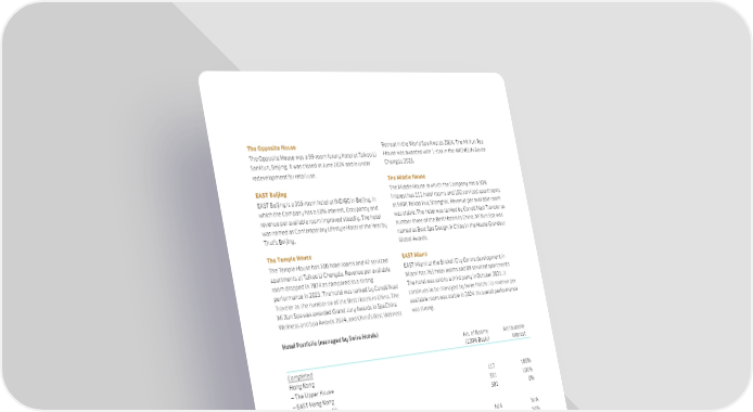 61 SWIRE PROPERTIES ANNUAL REPORT 2024 Hotel Portfolio (managed by Swire Hotels) No. of Rooms (100% Basis) Attributable Interest Completed Hong Kong – The Upper House 117 100% – EAST Hong Kong 331 100% – Headland Hotel (1) 501 0% Chinese Mainland – The Opposite House (2) N/A N/A – EAST Beijing 365 50% – The Temple House (3) 142 100% – The Middle House (3) 213 50% U.S.A. – EAST Miami (4) 352 0% Total 2,021 (1) Headland Hotel is owned by Airline Property Limited, a wholly-owned subsidiary of Cathay Pacific Airways Limited. (2) The Opposite House was closed in June 2024 and is under redevelopment for retail use. (3) Comprising one hotel tower and one serviced apartment tower. (4) EAST Miami (including serviced apartments in the hotel tower) is owned by a third party. The Opposite House The Opposite House was a 99-room luxury hotel at Taikoo Li Sanlitun, Beijing. It was closed in June 2024 and is under redevelopment for retail use. EAST Beijing EAST Beijing is a 365-room hotel at INDIGO in Beijing, in which the Company has a 50% interest. Occupancy and revenue per available room improved steadily. The hotel was named as Contemporary Lifestyle Hotel of the Year by That’s Beijing. The Temple House The Temple House has 100 hotel rooms and 42 serviced apartments at Taikoo Li Chengdu. Revenue per available room dropped in 2024 as compared to a strong performance in 2023. The hotel was ranked by Condé Nast Traveler as the number six of the Best Hotels in China. The Mi Xun Spa was awarded Grand Jury Awards in SpaChina Wellness and Spa Awards 2024, and China’s Best Wellness Retreat in the World Spa Awards 2024. The Mi Xun Tea House was awarded with 1-star in the MICHELIN Guide Chengdu 2025. The Middle House The Middle House in which the Company has a 50% interest has 111 hotel rooms and 102 serviced apartments at HKRI Taikoo Hui, Shanghai. Revenue per available room was stable. The hotel was ranked by Condé Nast Traveler as number three of the Best Hotels in China. Mi Xun Spa was named as Best Spa Design in China in the Haute Grandeur Global Awards. EAST Miami EAST Miami at the Brickell City Centre development in Miami has 263 hotel rooms and 89 serviced apartments. The hotel was sold to a third party in October 2021. It continues to be managed by Swire Hotels. Its revenue per available room was stable in 2024. Its overall performance was strong.