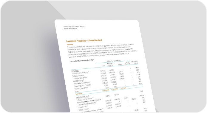 44 MANAGEMENT DISCUSSION & ANALYSIS REVIEW OF OPERATIONS Chinese Mainland Property Portfolio (1) GFA (sq. ft.) (100% Basis) Total Investment Properties Hotels Under Planning Attributable Interest Completed Taikoo Li Sanlitun, Beijing (2) 1,618,801 1,618,801 – – 100% Taikoo Li Chengdu 1,654,565 1,461,428 193,137 – 100% Taikoo Hui, Guangzhou 3,782,327 3,272,893 509,434 – 97% INDIGO, Beijing (3) 1,894,141 1,535,840 358,301 – 50% HKRI Taikoo Hui, Shanghai 3,731,964 3,155,381 576,583 – 50% Taikoo Li Qiantan, Shanghai 1,188,727 1,188,727 – – 50% Hui Fang, Guangzhou 90,847 90,847 – – 100% Others 2,917 2,917 – – 100% Sub-Total 13,964,289 12,326,834 1,637,455 – Under Development Taikoo Li Sanlitun, Beijing (2) 169,463 169,463 – – 100% Taikoo Place Beijing (formerly known as INDIGO Phase Two, Beijing) (4) 4,045,514 3,698,711 346,803 – 49.895% Taikoo Li Xi’an (5) 2,896,119 – – 2,896,119 70% Taikoo Li Sanya (6) 2,294,474 2,294,474 – – 50% Shanghai New Bund Mixed-use Project (7) 2,943,782 2,943,782 – – 40% Lujiazui Taikoo Yuan (formerly known as Shanghai Yangjing Mixed-use Project), Shanghai (8) 2,886,453 1,347,201 – 1,539,252 40% Taikoo Li Julong Wan Guangzhou (9) 351,746 351,746 – – 50% No. 387 Tianhe Road, Guangzhou (10) 654,782 654,782 – – 97% Sub-Total 16,242,333 11,460,159 346,803 4,435,371 Total 30,206,622 23,786,993 1,984,258 4,435,371 (1) Including hotels and properties leased for investment. (2) The Opposite House hotel was closed in June 2024 and is under redevelopment for retail use. (3) INDIGO forms part of Taikoo Place Beijing. (4) This is an office-led mixed-use development. The development is planned to be completed in two phases from mid-2026. The Group acquired a 14.895% equity interest of this development in August 2024. As a result, the Group’s interest increased from 35% to 49.895%. Taikoo Place Beijing has been renamed from INDIGO Phase Two since November 2024. (5) This is a retail-led mixed-use development. The total GFA is subject to change. The development is planned to be completed in phases from 2027. (6) This is a retail-led development. The development is planned to be completed in phases from 2026. Project name has yet to be confirmed. (7) This is a mixed-use development. The development is planned to be completed in 2026. (8) This is a mixed-use development. The development scheme is being planned. The development is expected to be completed in phases from 2026. (9) This is the retail portion of a mixed-use development in Liwan district of Guangzhou. GFA as shown above represented the sites acquired as of 31st December 2024. The GFA will increase to approximately 1,615,000 square feet, subject to further relevant transaction agreements. The Group has a 50% interest in the retail portion of the development. The development scheme is being planned. The overall development is planned to be completed in phases from the first half of 2027. (10) This property, as an extension to the shopping mall of Taikoo Hui in Guangzhou, was acquired in August 2024. The refurbishment of the property is expected to be completed from 2027. Investment Properties – Chinese Mainland Overview The property portfolio in the Chinese Mainland comprises an aggregate of 30.2 million square feet of space, 18.9 million square feet of which is attributable to the Group. Completed properties amount to 14.0 million square feet, with 16.2 million square feet under development. Total attributable gross rental income from investment properties in the Chinese Mainland was HK$6,154 million in 2024. At 31st December 2024, the investment properties in the Chinese Mainland were valued at HK$124,538 million. Of this amount, the Group’s attributable interest was HK$89,007 million.