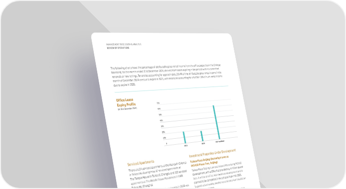 70% 50% 60% 40% 10% 30% 20% 0 2025 2026 Office Lease Expiry Profile (At 31st December 2024) 2027 and later 52 MANAGEMENT DISCUSSION & ANALYSIS REVIEW OF OPERATIONS The following chart shows the percentage of attributable gross rental income from the office properties in the Chinese Mainland, for the month ended 31st December 2024, derived from leases expiring in the periods with no committed renewals or new lettings. Tenancies accounting for approximately 20.4% of the attributable gross rental income in the month of December 2024 are due to expire in 2025, with tenancies accounting for a further 18% of such rental income due to expire in 2026. Serviced Apartments There are 24 serviced apartments at the Mandarin Oriental in Taikoo Hui Guangzhou, 42 serviced apartments at The Temple House in Taikoo Li Chengdu and 102 serviced apartments at The Middle House Residences in HKRI Taikoo Hui Shanghai. The performance of the serviced apartments in 2024 was mixed. Occupancy at the Mandarin Oriental in Guangzhou, The Temple House in Chengdu and The Middle House Residences in Shanghai was 88%, 52% and 84% respectively at 31st December 2024. Chinese Mainland Serviced Apartments Market Outlook The performance of the serviced apartments is expected to remain stable in 2025. Investment Properties Under Development Taikoo Place Beijing (formerly known as INDIGO Phase Two, Beijing) Taikoo Place Beijing is an extension of the existing INDIGO development, with a GFA of approximately 4 million square feet. It will be an office-led mixed-use development and is planned to be completed in two phases from mid-2026. Superstructure works, mechanical and electrical installation works are in progress. In June 2024, the Group entered into an equity and debt transfer agreement with the China Life group and the Sino-Ocean group, pursuant to which the Group and the China Life group have conditionally agreed to acquire a 14.895% and a 49.895% equity interest in the project company of Taikoo Place Beijing, respectively, from the Sino-Ocean group. The acquisitions were completed in early August. Following the completion of the acquisitions, the Group’s interest in Taikoo Place Beijing has increased from 35% to 49.895% and the China Life group owns a 49.895% interest in Taikoo Place Beijing. Taikoo Place Beijing has been renamed from INDIGO Phase Two since November 2024.
