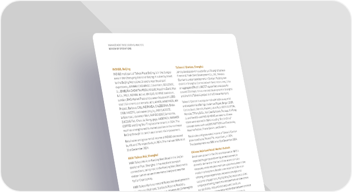 48 MANAGEMENT DISCUSSION & ANALYSIS REVIEW OF OPERATIONS INDIGO, Beijing INDIGO mall, part of Taikoo Place Beijing, is in the Jiangtai area in the Chaoyang district of Beijing. It is directly linked to the Beijing Metro Line 14 and is near the airport expressway. ARMANI EXCHANGE, Calvin Klein, DESCENTE, i.t, JEWELRIA CHOW TAI FOOK, KAILAS, Massimo Dutti, Max & Co., MUJI, NEIWAI Active, UNIQLO, SiSYPHE bookstore, sundan, BHG Market Place and a seven-house with 1,000- seat CGV cinema are tenants. AFU, AIMER, AIMER KIDS, AW Project, Barbour, CALL ME PANDA, CALZEDONIA, Erdos 1980, HAZZYS, icebreaker, jnby by JNBY, LACOSTE, LeSportsac, lululemon Men, RAPIDO GOLF, Samsonite, ZUCZUG Flat, Chao Jia Xiang, gaga, LADERACH, MANNER COFFEE and Qing Shui Ting became tenants in 2024. The mall has strengthened its market position in the northeast Beijing through its continuous tenant mix improvement. Retail sales and gross rental income at INDIGO decreased by 4% and 2% respectively in 2024. The mall was 98% let at 31st December 2024. HKRI Taikoo Hui, Shanghai HKRI Taikoo Hui is on Nanjing West Road in the Jing’an district of Puxi, Shanghai. It has excellent transport connections, being next to the Nanjing West Road metro station (which serves three metro lines) and near the Yan’an Expressway. HKRI Taikoo Hui is our second Taikoo Hui development in the Chinese Mainland. Starbucks Reserve Roastery, CANADA GOOSE, COS, Diptyque, drivepro lab, Ermenegildo Zegna, Fred, Guerlain, Golden Goose, IWC, lululemon, LOEWE, Max Mara, Nio, RIMOWA, self-portrait, SPACE, Tesla, Ho Hung Kee, KANPAI CLASSIC, Shanghai Club, The Cheesecake Factory, Venchi and a city’super supermarket are tenants. Ahma Handmade, BALENCIAGA, BEIGEL TREE, Joyce Beauty, L’Artisan Parfumeur, Moncler, Penhaligon’s and Rolex became tenants in 2024. Retail sales and gross rental income at HKRI Taikoo Hui decreased by 14% and 17%, respectively, in 2024, reflecting disruption caused by the major structural and reconfiguration works to cater for tenant mix improvement. The mall was 93% let at 31st December 2024 including spaces allocated to prospective tenants who have signed letters of intent. Taikoo Li Qiantan, Shanghai Jointly developed with a subsidiary of Shanghai Lujiazui Finance & Trade Zone Development Co., Ltd., Taikoo Li Qiantan is a retail development in Qiantan, Pudong new district in Shanghai. Connected with three metro lines, it has an aggregate GFA of 1,188,727 square feet and space for around 270 shops. It is our second development in Shanghai and the third Taikoo Li project in the Chinese Mainland. Taikoo Li Qiantan is a popular mall with both luxury retail and experiential offerings. Audemars Piguet, Bvlgari, DIOR, Cartier, Gucci, Hermès, Huawei, Lotus Nyo, LOUIS VUITTON, Moncler, Tiffany & Co., Van Cleef & Arpels, Tsutaya, Xin Rong Ji, and the 656-seat MOViE MOViE are tenants. 59 new stores were opened in 2024 including “first in China” concept stores such as LOUIS VUITTON’s Le Chocolat by Maxime Federic, Frame Denim, and Evidens. Retail sales and gross rental income at Taikoo Li Qiantan grew steadily by 3% and 7%, respectively, in 2024. The development was 98% let at 31st December 2024. Chinese Mainland Retail Market Outlook Retail sales growth in the Chinese Mainland in 2025 is expected to gain pace driven by an improvement in domestic demand on the back of the recent stimulus measures, whilst retailers maintain a positive outlook in the medium to long-term. Retailers are expected to focus on offering unique experiences, exclusive concepts and customer engagement, highlighting the importance of the unique positioning, brand mix and premium services across our portfolios. Inbound and outbound travels are anticipated to increase and a recalibration between onshore and offshore spending behaviour from customers as compared to pre-pandemic pattern is expected. However, in the long-term, it is expected that onshore spending will still account for the majority of the total retail business in the Chinese Mainland. Meanwhile, the number of Chinese luxury customers is anticipated to keep increasing, highlighting the Chinese Mainland as one of the largest luxury retail markets globally. The market demand on retail space is expected to be prudent in 2025. While retailers of luxury brands will remain cautious on expansions in Beijing, Chengdu and Shanghai where the Group is operating, demand for spaces in key locations with high potentials and experiential offerings is expected to continue. In Guangzhou, demand for space from luxury brands is expected to be sustained. Overall, demand from sports and leisure brands is expected to increase.