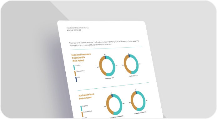 56% 42% 2% 54% 43% 3% Hong Kong Chinese Mainland U.S.A. Completed Investment Properties GFA (Excl. Hotels) 31st December 2023 31st December 2024 58% 40% 2% 56% 41% 3% Hong Kong Chinese Mainland U.S.A. Attributable Gross Rental Income Year ended 31st December 2023 Year ended 31st December 2024 74% 23% 3% 73% 24% 3% Hong Kong Chinese Mainland U.S.A. and elsewhere Net Assets Employed 31st December 2023 31st December 2024 36 MANAGEMENT DISCUSSION & ANALYSIS REVIEW OF OPERATIONS The charts below show the analysis of the Group’s completed investment properties GFA (excluding hotels), gross rental income and net assets employed by region on an attributable basis.