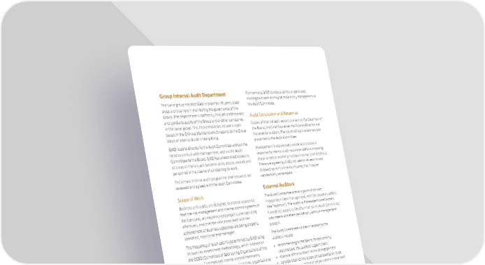 107 SWIRE PROPERTIES ANNUAL REPORT 2024 Group Internal Audit Department The Swire group has had GIAD in place for 29 years. GIAD plays a critical role in monitoring the governance of the Group. The department is staffed by 29 audit professionals and conducts audits of the Group and of other companies in the Swire group. The 29 professionals include a team based in the Chinese Mainland which reports to the Group Head of Internal Audit in Hong Kong. GIAD reports directly to the Audit Committee without the need to consult with management, and via the Audit Committee to the Board. GIAD has unrestricted access to all areas of the Group’s business units, assets, records and personnel in the course of conducting its work. The annual internal audit programme and resources are reviewed and agreed with the Audit Committee. Scope of Work Business unit audits are designed to provide assurance that the risk management and internal control systems of the Company are implemented properly and operating effectively, and that the risks associated with the achievement of business objectives are being properly identified, monitored and managed. The frequency of each audit is determined by GIAD using its own risk assessment methodology, which is based on the COSO (Committee of Sponsoring Organizations of the Treadway Commission) internal control framework, considering such factors as recognised risks, organisational change, overall materiality of each unit, previous internal audit results, external auditors’ comments, output from the work of the Swire Pacific Group Risk Management Committee and management’s views. Each business unit is typically audited at least once every three years. Acquired businesses would normally be audited within 12 months. 11 assignments were conducted for Swire Properties in 2024. In addition, GIAD assists the Audit Committee in carrying out the analysis and independent appraisal of the adequacy and effectiveness of the Group’s risk management and internal control systems through its review of the process by which management has completed the annual control self-assessment, and the results of this assessment. Furthermore, GIAD conducts ad-hoc projects and investigative work as may be required by management or the Audit Committee. Audit Conclusion and Response Copies of internal audit reports are sent to the Chairman of the Board, the Chief Executive, the Finance Director and the external auditors. The results of each review are also presented to the Audit Committee. Management is required to provide action plans in response to internal audit recommendations, including those aimed at resolving material internal control defects. These are agreed by GIAD, included in its reports and followed up with a view to ensuring that they are satisfactorily undertaken. External Auditors The Audit Committee acts as a point of contact, independent from management, with the external auditors (the “auditors”). The auditors, PricewaterhouseCoopers, have direct access to the Chairman of the Audit Committee, who meets with them periodically without management present. The Audit Committee’s duties in relation to the auditors include: • recommending to the Board, for approval by shareholders, the auditors’ appointment • approval of the auditors’ terms of engagement • consideration of the letters of representation to be provided to the auditors in respect of the interim and annual financial statements • review of reports and other ad-hoc papers from the auditors • annual appraisal of the quality and effectiveness of the auditors • assessment of the auditors’ independence and objectivity, including the monitoring of non-audit services provided, with a view to ensuring that their independence and objectivity are not, and are not seen to be, compromised • approval of audit and non-audit fees