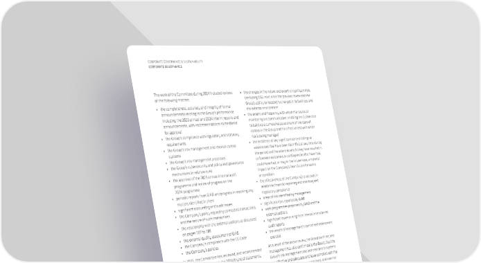 106 CORPORATE GOVERNANCE & SUSTAINABILITY CORPORATE GOVERNANCE The work of the Committee during 2024 included reviews of the following matters: • the completeness, accuracy and integrity of formal announcements relating to the Group’s performance including the 2023 annual and 2024 interim reports and announcements, with recommendations to the Board for approval • the Group’s compliance with regulatory and statutory requirements • the Group’s risk management and internal control systems • the Group’s risk management processes • the Group’s cybersecurity and policy and governance mechanisms in relation to AI • the approval of the 2025 annual internal audit programme and review of progress on the 2024 programme • periodic reports from GIAD and progress in resolving any matters identified in them • significant accounting and audit issues • the Company’s policy regarding connected transactions and the nature of such transactions • the relationship with the external auditors as discussed on pages 107 to 108 • the external quality assessment of GIAD • the Company’s compliance with the CG Code • the Company’s policies In 2025, the Committee has reviewed, and recommended to the Board for approval, the 2024 financial statements. Assessing the Effectiveness of Risk Management and Internal Control Systems On behalf of the Board, the Audit Committee reviews annually the continued effectiveness of the Group’s risk management and internal control systems dealing with risk and financial accounting and reporting, the effectiveness and efficiency of operations, compliance with laws and regulations, and risk management functions. This assessment considers: • the scope and quality of management’s ongoing monitoring of risks (including ESG risks) and of the risk management and internal control systems, the work and effectiveness of internal audit and the assurances provided by the Finance Director • the changes in the nature and extent of significant risks (including ESG risks) since the previous review and the Group’s ability to respond to changes in its business and the external environment • the extent and frequency with which the results of monitoring are communicated, enabling the Committee to build up a cumulative assessment of the state of control in the Group and the effectiveness with which risk is being managed • the incidence of any significant control failings or weaknesses that have been identified at any time during the period and the extent to which they have resulted in unforeseen outcomes or contingencies that have had, could have had, or may in the future have, a material impact on the Company’s financial performance or condition • the effectiveness of the Company’s processes in relation to financial reporting and statutory and regulatory compliance • areas of risk identified by management • significant risks reported by GIAD • work programmes proposed by GIAD and the external auditors • significant issues arising from internal and external audit reports • the results of management’s control self-assessment exercise As a result of the above review, the Board confirms, and management has also confirmed to the Board, that the Group’s risk management and internal control systems are effective and adequate and have complied with the CG Code provisions on risk management and internal control throughout the year and up to the date of this annual report. Company Secretary The Company Secretary is an employee of the Company and is appointed by the Board. The Company Secretary is responsible for facilitating the Board’s processes and communications among Board members, with shareholders and with management. The Company Secretary undertakes at least 15 hours of relevant professional training annually to update skills and knowledge.