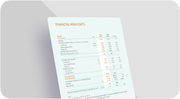 12,000 10,000 8,000 6,000 4,000 2,000 0 -2,000 2024 2023 (219) (202) 6,768 6,900 7,525 289 11,570 4,285 (140) (100) HK$M Property trading Recurring underlying profit 6,479 Recurring underlying profit 7,285 Hotels Property investment Divestment Underlying Profit/(Loss) by Segment 12 Results For the year Note 2024 HK$M 2023 HK$M Change Revenue 14,428 14,670 -2% Profit/(Loss) attributable to the Company’s shareholders Underlying (a), (b) 6,768 11,570 -42% Recurring underlying (a), (b) 6,479 7,285 -11% Reported (766) 2,637 N/A Cash generated from operations 6,489 7,492 -13% Net cash outflow before financing (2,515) (8,416) -70% HK$ HK$ Earnings/(Loss) per share Underlying (c) 1.16 1.98 -41% Recurring underlying (c) 1.11 1.25 -11% Reported (c) (0.13) 0.45 N/A Dividend per share First interim 0.34 0.33 +3% Second interim 0.76 0.72 +6% Financial Position At 31st December HK$M HK$M Total equity (including non-controlling interests) 278,427 288,149 -3% Net debt 43,746 36,679 +19% Gearing ratio (a) 15.7% 12.7% +3.0%pt. HK$ HK$ Equity attributable to the Company’s shareholders per share (a), (d) 47.35 48.73 -3% Notes: (a) Refer to glossary on page 215 for definition. (b) A reconciliation between reported (loss)/profit and underlying profit attributable to the Company’s shareholders is provided on page 29. (c) Refer to note 14 to the financial statements for the weighted average number of shares. (d) Refer to note 33 to the financial statements for the number of shares at the year end. FINANCIAL HIGHLIGHTS