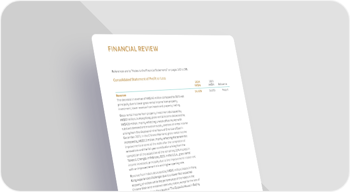 References are to “Notes to the Financial Statements” on pages 143 to 198. Consolidated Statement of Profit or Loss 2024 HK$M 2023 HK$M Reference Revenue The decrease in revenue of HK$242 million compared to 2023 was principally due to lower gross rental income from property investment, lower revenue from hotels and property trading. Gross rental income from property investment decreased by HK$92 million. In Hong Kong, gross rental income decreased by HK$428 million, mainly reflecting a weak office market with subdued demand and a surplus supply, and loss of rental income arising from the disposal of nine floors of One Island East in December 2023. In the Chinese Mainland, gross rental income increased by HK$313 million, mainly reflecting the tenant mix improvements in some of the malls after the completion of renovations and the full year contribution arising from the completion of the acquisition of the remaining 35% interest in Taikoo Li Chengdu in February 2023. In the U.S.A., gross rental income increased, principally due to the improvement in base rent with an improved tenant mix and higher opening rate. Revenue from hotels decreased by HK$91 million. Hotels in Hong Kong experienced challenges due to a slower than expected recovery of visitors while the performance of the hotels in the Chinese Mainland remained relatively stable, except for the loss of revenue arising from the closure of The Opposite House in Beijing since June 2024. Revenue from property trading decreased by HK$78 million from 2023. In 2024, revenue was recognised from the sale of 2 units of EIGHT STAR STREET in Hong Kong whereas revenue from the sale of 6 units of EIGHT STAR STREET was recognised in 2023. 14,428 14,670 Note 4 FINANCIAL REVIEW 74