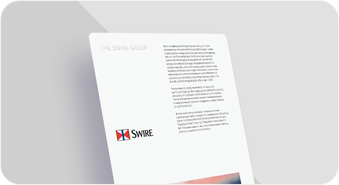 THE SWIRE GROUP Swire is a highly diversified global group. Many of our core businesses can be found within the Asia Pacific region, where traditionally Swire’s operations have centred on the Hong Kong SAR and the Chinese Mainland. Within Asia, Swire activities come under the Group’s publicly quoted arm, Swire Pacific Limited. Swire Pacific’s strategy is focused on Greater China and Southeast Asia, where the company seeks to grow its core businesses of Property, Beverages, and Aviation, as well as new areas of growth such as healthcare and sustainable foods. As a subsidiary of Swire Pacific, Swire Properties was listed on the Main Board of the Hong Kong Stock Exchange in 2012. The Swire brand is highly respected for its history and commercial integrity. The company prides itself on the originality and quality of its products, and the consistency of its services. The Swire Group seeks to foster long-term sustainable growth through active participation in management, underpinned by a strong financial base. With its long history in the region, the Group has made significant contributions to economic development in Hong Kong and on the Chinese Mainland. The motto of the Swire Group is “Esse Quam Videri”, meaning “To Be, Rather Than to Seem to Be”. The values implicit in this motto include integrity, humility, endeavour, excellence, and continuity. PAGE 130 SWIRE PROPERTIES