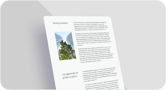 Setting standards In 1985 Swire Properties purchased a seemingly isolated plot of land in Admiralty, then home to the former Victoria Barracks. Envisaging the masterplan for a successful future that no one else imagined at the time, created fertile ground for transformative placemaking. On a notable tract of land in a prime location, with an original idea and a blueprint, conveniently connected to the rest of the city. Gaining status over the past four decades as a pioneering integrated development, Pacific Place has demonstrated that the best places are deliberately created with intent, ensuring that the whole is greater than the sum of its parts. Top-tier office space that extended Central Business District; a cluster of five-star hotels, exclusive high-rise serviced apartments and an ingeniously-designed retail stage created a new benchmark for mixed-use developments in the region; putting Admiralty firmly on the map. And Swire Properties’ visionary master plan didn’t stop there. An innovative new tunnel linking Pacific Place with Wan Chai allowed careful extension into the surrounding community. This delivered a plan of revitalisation for Star Street Precinct – with prime office space, re-designed residences and an enhanced streetscape, the vibrant backdrop to new shops, bars, restaurants and landscaped open spaces. Returning to a historical Hong Kong neighbourhood the refreshed hallmarks of texture, colour and personality; even willingly investing resources on initiatives to the benefit of the wider community. st The opportunity for In the decade before the turn of the 21 century, Hong Kong had begun to identify global recognition new commercial zones and vibrant employment hubs across the city. One was Quarry Bay, where Swire Properties had over 100 years of association. The company seized a unique opportunity – invested in land and built a premium office- led infrastructure. And ultimately, its transformation into the present-day global business district, Taikoo Place. This has been placemaking on a grand scale. Taikoo Place is now home to over 300 international corporations and successfully serves the widest needs of more than 35,000 office workers. Anchored by two MTR stations, with ten premium office towers, including One and Two Taikoo Place, Hong Kong’s smartest and greenest offices, the complex is inventively connected by an expansive series of elevated footbridges. With vibrant hubs enhanced by the convenience of restaurants, bars and a members’ club, and with EAST offering residences and a lifestyle hotel on the doorstep, Taikoo Place delivers the efficiencies of business life balanced by recreational spaces. Here, landscaped gardens and parks are brought to life by artistic installations, seasonal markets and a dedicated approach to sustainable community-building. SWIRE PROPERTIES PAGE 7