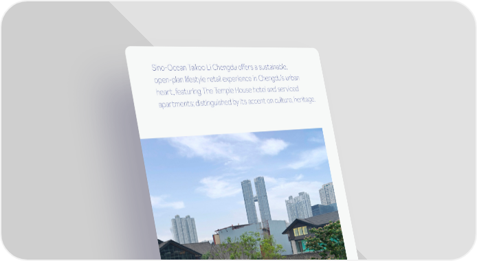 SINO-OCEAN Sino-Ocean Taikoo Li Chengdu offers a sustainable, open-plan lifestyle retail experience in Chengdu’s urban TAIKOO LI CHENGDUheart, featuring The Temple House hotel and serviced apartments; distinguished by its accent on culture, heritage. SWIRE PROPERTIES PAGE 71