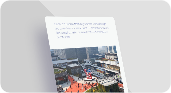 Opened in 2021 and featuring wellness-themed design and green leisure spaces, Taikoo Li Qiantan is the world’s first shopping mall to be awarded WELL Core Platinum Certification. SWIRE PROPERTIES PAGE 77
