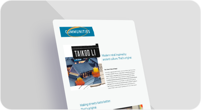 Modern retail inspired by ancient culture. That’s original. Sino-Ocean Taikoo Li Chengdu In a world struggling to protect tradition and cultural identity, Sino-Ocean Taikoo Li Chengdu is a breath of fresh air. Instead of the conventional tower approach, Taikoo Li Chengdu, designed by The Oval Partnership, architects of Taikoo Li Sanlitun, continued the ‘lane ’retail concept with a strong aesthetic directly inspired by traditional Sichuan architecture with an innovative, modern approach. This example of the Taikoo Li concept features six traditional courtyards and buildings within the site that have been preserved and revitalised. The adjacent Daci Temple also contributes to the historical and cultural essence of the complex. Modern retail concepts inspired by ancient culture. That’s original. Making streets taste better. That’s original. Tong Chong Street Market Tong Chong Street Market is a great example of how thinking outside of the box can transform neighbourhoods and communities. Established in 2016 as a way to promote a new and emerging culinary art form - gourmet street food. Tong Chong Street Market has grown to be a haven for advocates and influencers of all things delicious as well as healthy and sustainable approaches to growing, cooking, reposting and recycling food. Each market-day is a vibrant, social event featuring everything from fresh farmers’ produce to creative dishes, cooking tips, and the latest food and beverage trends. Making streets taste better. That’s original. PAGE 12 SWIRE PROPERTIES