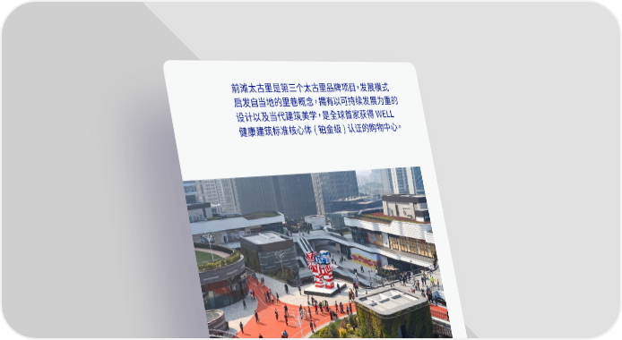 Swire Properties Corporate Brochure 2022 SC Page 78 Page 80前滩太古里是第三个太古里品牌项目,发展模式 启发自当地的里巷概念,拥有以可持续发展为重的 设计以及当代建筑美学,是全球首家获得WELL 健康建筑标准核心体( 铂金级) 认证的购物中心。 太古地产 77 第 页