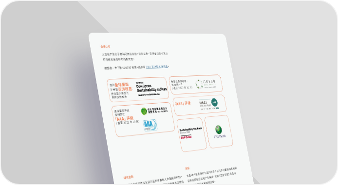 全球认可 太古地产致力于推动可持续发展,领先业界,获得全球多个顶尖 可持续发展指标和指数肯定。 如想進一步了解SD2030策略,請參看2021可持续发展报告。 位列 全球业界领导者- 全球第四 连续第六年 并荣登 : 亚洲榜首 ( 截至2022年11月) 连续第六年成为 世界指数成员 「 」评级 连续第五年成 AAA 位列首位 「 」评级 AAA ( 截至2022年10月) 绿色金融 减碳 我们决意将可持续发展方面的考量纳入金融融资机制。 太古地产是香港和中国内地首个以科学为基础指定减碳 太古地产通过发行绿色债券以及与可持续发展表现挂钩 目标并获批核的地产发展商,按照《巴黎协定》为全球 的贷款,促进经济转型,向低碳、更高资源效益以及可 物业组合制定长期减碳目标。 持续发展的未来迈进: 我们按照气候相关财务信息披露工作组(TCFD)的建议, • 为全港首项获香港品质保证局颁发 “绿色金融认证”之绿色债劵 公 布“ 管 治 ”、“ 策 略 ”、“ 风 险 管 理 ”以 及“ 指 标 和 目 标 ” • 绿色债券筹得资金净额全数分配予环保建筑项目 四个核心类别的气候相关财务资料。 • 订立首笔跟可持续发展表现挂钩的贷款,总值港币5亿元, 其利率因应环境、社会和企业管治表现的按年改善幅度作调整 • 现时约30% 的债券及借款融资来自绿色金融 32 太古地产 第 页