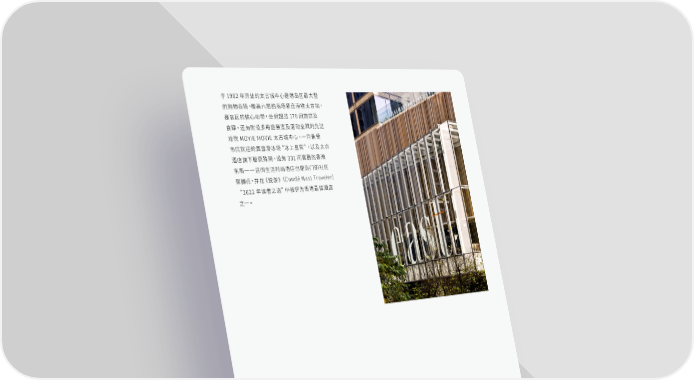 于1982年开业的太古城中心是港岛区最大型 的购物商场,楼高六层的商场紧连港铁太古站, 是该区的核心地带,坐拥超过170间商店及 食肆,还有附设多用途展览及活动空间的先进 戏院MOViE MOViE 太古城中心、一向备受 市民欢迎的真雪滑冰场“冰上皇宫”,以及太古 酒店旗下屡获殊荣、设有331间客房的香港 东隅──这间生活时尚酒店也是热门的社区 聚脚点,并在《悦游》(Condé Nast Traveler) “2022 年读者之选”中被评为香港最佳酒店 之一。 太古城中心 零售 车位 平方尺 超过 个 1,100,000 800 酒店 所 有 平方尺 发 总楼面面积数据均以主要已落成项目及 展中项 目 为 基础 , 所 有数字均按1 00% 200,000 为基准呈列。 太古地产 53 第 页