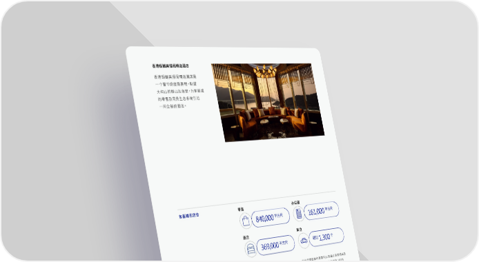 香港银樾美憬阁精选酒店 香港银樾美憬阁精选酒店是 一个奢华的度假胜地,眺望 大屿山的群山及海景,为东荟城 的零售及商务生态系统引进 一间全新的酒店。 东荟城名店仓 零售 办公楼 平方尺 平方尺 840,000 161,000 酒店 车位 平方尺 超过 个 369,000 1,300 所 有 发 总楼面面积数据均以主要已落成项目及 展中项 目 为 基础 , 所 有数字均按1 00% 为基准呈列。 1 香港银樾美憬阁精选酒店 1 2 3 4 2 东荟城名店仓 3 东荟城第一座 4 香港诺富特东荟城酒店 太古地产 63 第 页