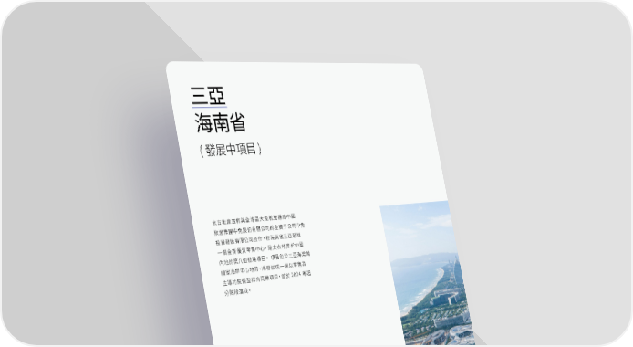 Swire Properties Corporate Brochure 2022 TC Page 99 Page 101三亞 海南省 ( 發展中項目) 太古地產宣佈與全球最大免稅營運商中國 旅遊集團中免股份有限公司的全資子公司中免 投資發展有限公司合作,在海南省三亞發展 一個全新優質零售中心,是太古地產於中國 內地的第八個發展項目。 項目位於三亞海棠灣 國家海岸中心地帶,將發展成一個以零售為 主導的度假型綜合商業項目,並於2024年起 分階段落成。 第 98 頁 太古地產